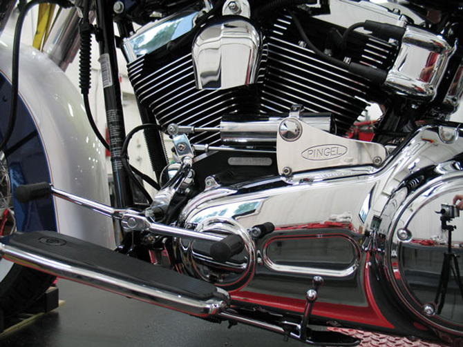 Electric Speed Shifter Kit for Softails with floorboards 2007-2017 and Softail Slim 2013-2017. Pingel Electric Speed Shifter Kits include a dual button handlebar control, a shift cylinder support bracket and the state of the art control module which sends a quick signal from the dual button handlebar control to the shift cylinder. Also included is the electronic engine kill module and step-by-step instructions with photos for an easy 2-3 hour installation.