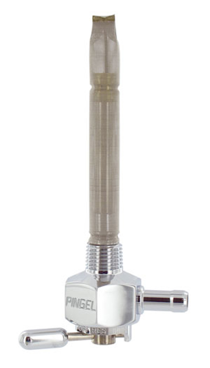 Power-Flo Single Outlet Reserve Fuel Valve. 1/4" NPT Inlet. 4000 Series. 5/16" hose barb. Aluminum finish. Hex design.
