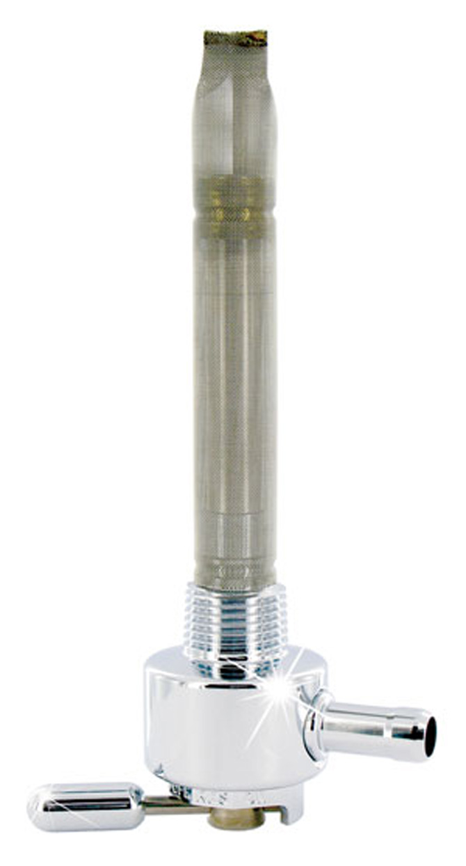 Power-Flo Single Outlet Reserve Fuel Valve. 3/8" NPT Inlet. 4000 Series. 5/16" hose barb. Chrome finish. Round design.