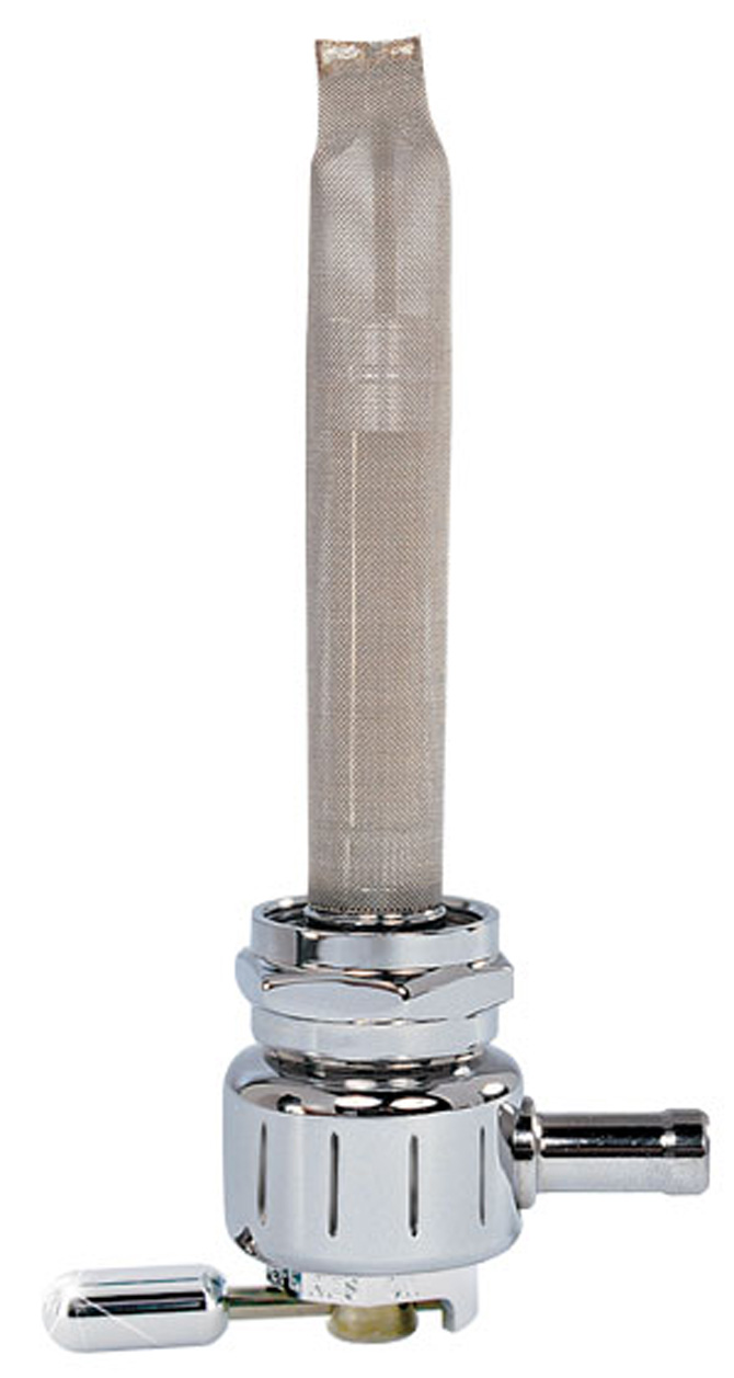 Power-Flo Single Outlet Reserve Fuel Valve. 22mm (H-D) Inlet. 4000 Series. 5/16" hose barb. Chrome finish. Round Vertical Groove design. Includes adapter nut.