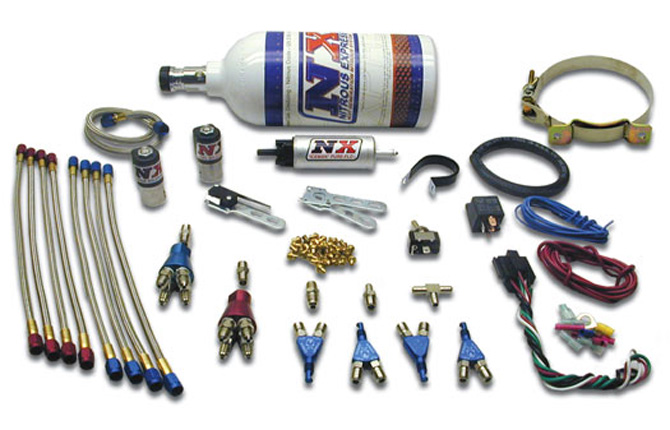 The NX 4 Cylinder Piranha Nozzle system is designed for all 4 cylinder applications without an existing fuel system for the nitrous kit. This system comes complete with new Lightning Solenoids, fuel pump, 2.5lb bottle, stainless steel bottle bracket, nitrous and fuel lines, relay and wiring harness, WOT activation switch and jetting for 40, 60, 80 and 100hp.