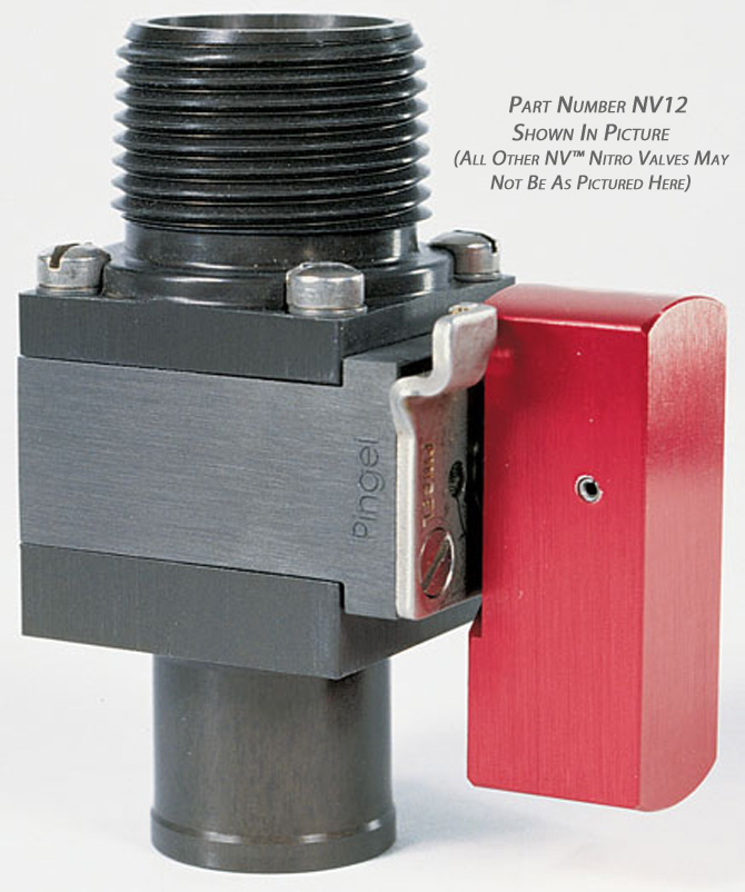 NV12R has a 1 inch NPT Inlet and 1 inch Hose Outlet. Remote included. Perhaps the ultimate fuel valve the NV Nitro Valve. Built tough from aircraft aluminum then anodized, the NV petcock includes many outstanding features such as spring- loaded detents for positive on/off positioning and stainless steel components. This valve was designed for nitromethane systems and flows at 9 gallons per minute. May also be used for gasoline and methanol. (Part number shown in picture is NV12, all other NV valves may look different than pictured)