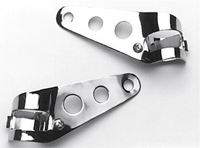 Chrome plated, fork mounted brackets with two lightening holes. Center of fork tube to center of hole for headlamp measures 5". Sold in pairs.