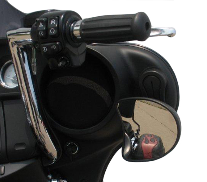 Unique design drops the OEM fairing mount mirrors 2-7/8" for that cool Bagger look on models with tall bars. Provides the same clear image with the OEM mirrors as compared to the shaky-blurred image when using handlebar mounted mirrors. Designed specifically for FLHX models, but will also fit FLHT models by drilling small holes in the inner fairing. Billet aluminum with a black finish. Mounting hardware and instructions included. Made in the U.S.A.